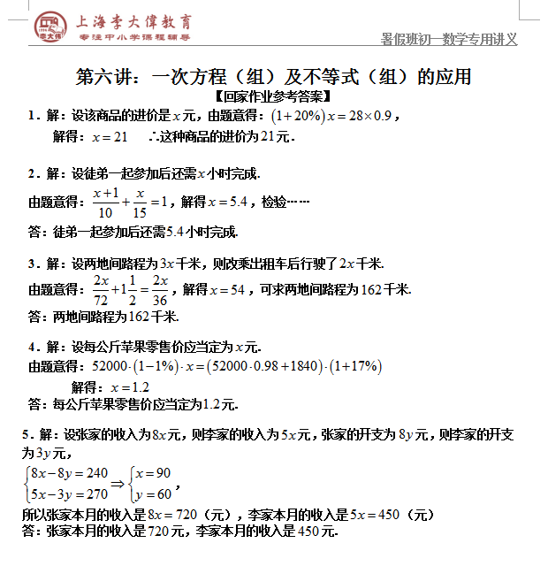 初一|暑假数学课后练习参考答案-5